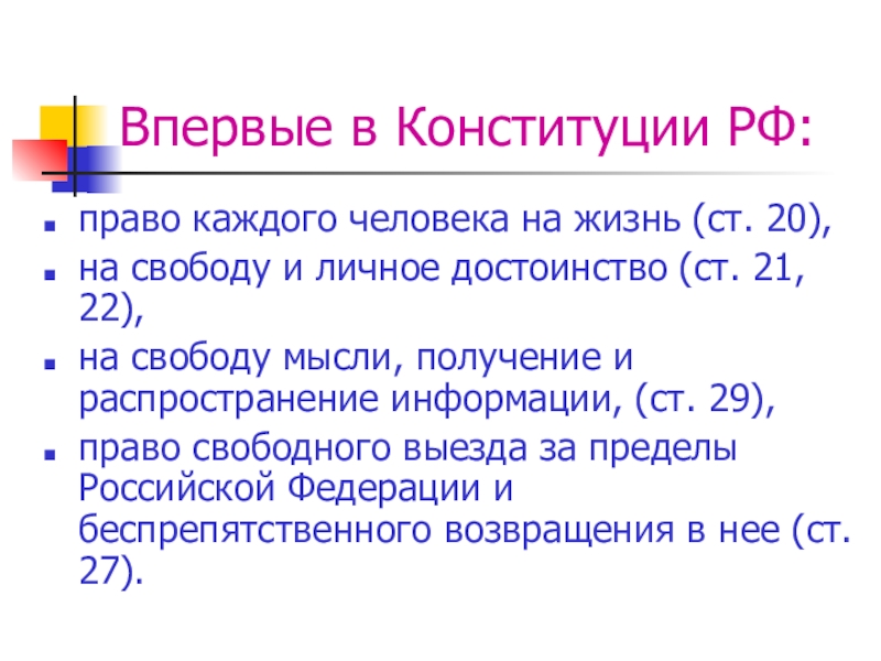 Впервые в Конституции РФ:право каждого человека на жизнь (ст. 20),на свободу и личное достоинство (ст. 21, 22),