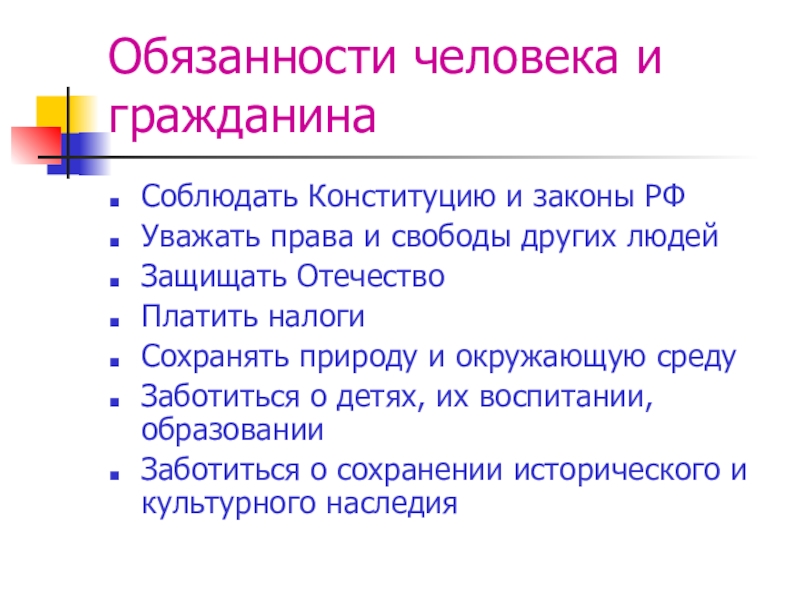 Обязанности человека и гражданинаСоблюдать Конституцию и законы РФУважать права и свободы других людейЗащищать ОтечествоПлатить налогиСохранять природу и