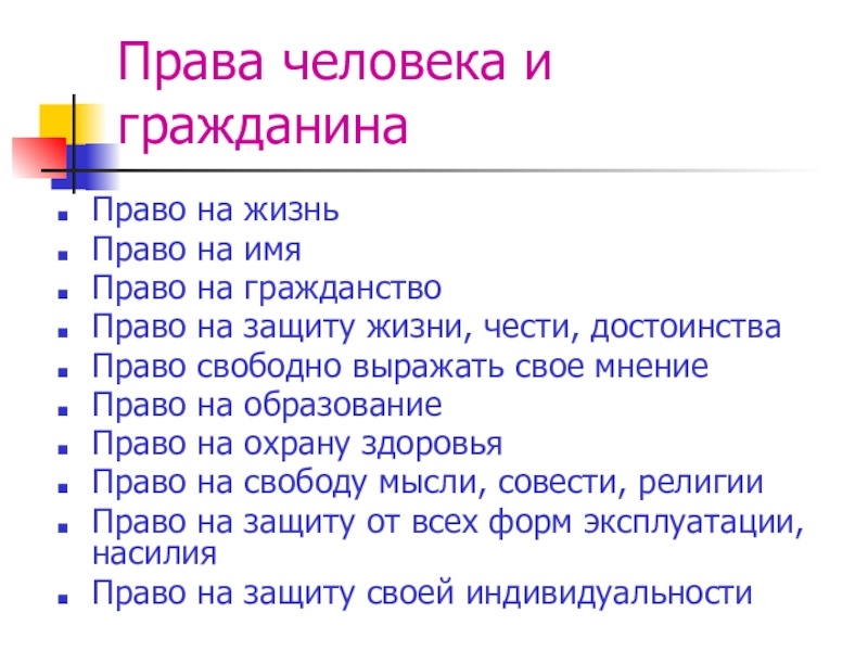 Права человека и гражданинаПраво на жизньПраво на имяПраво на гражданствоПраво на защиту жизни, чести, достоинстваПраво свободно выражать