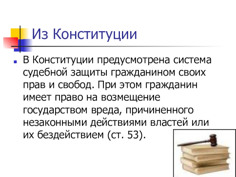 Из КонституцииВ Конституции предусмотрена система судебной защиты гражданином своих прав и свобод. При этом гражданин имеет право