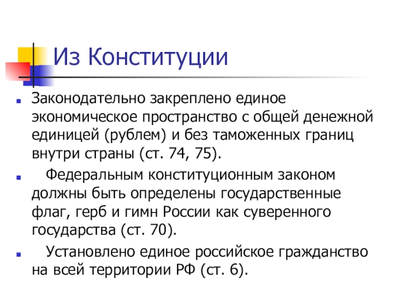 Из КонституцииЗаконодательно закреплено единое экономическое пространство с общей денежной единицей (рублем) и без таможенных границ внутри страны