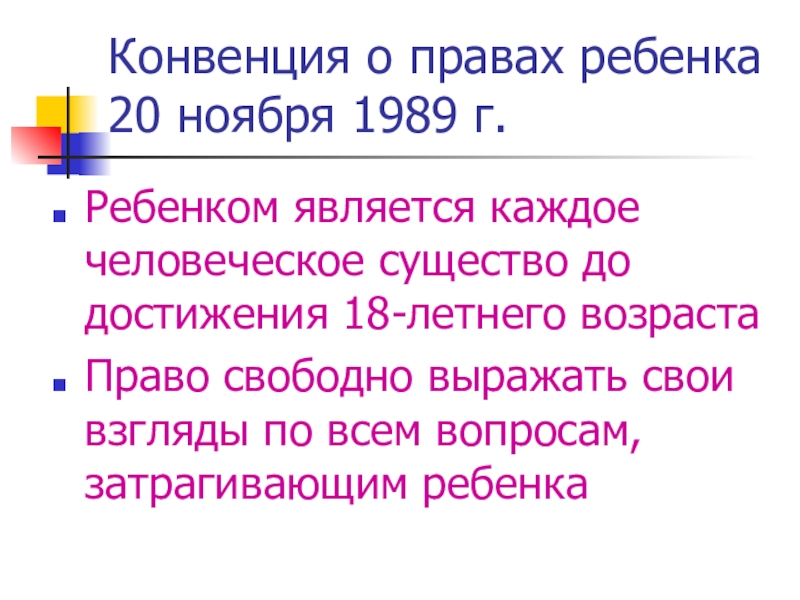 Конвенция о правах ребенка 20 ноября 1989 г.Ребенком является каждое человеческое существо до достижения 18-летнего возрастаПраво свободно