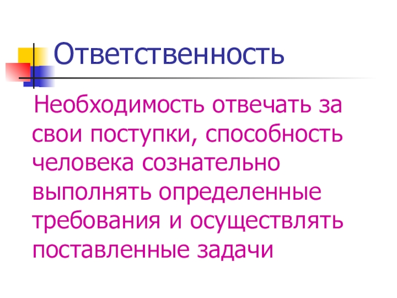 Ответственность  Необходимость отвечать за свои поступки, способность человека сознательно выполнять определенные требования и осуществлять поставленные задачи
