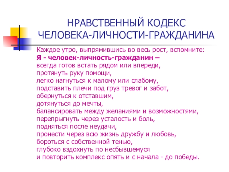 НРАВСТВЕННЫЙ КОДЕКС ЧЕЛОВЕКА-ЛИЧНОСТИ-ГРАЖДАНИНАКаждое утро, выпрямившись во весь рост, вспомните: Я - человек-личность-гражданин –всегда готов встать рядом или