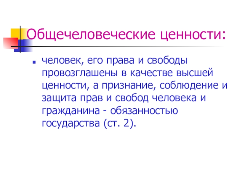 Общечеловеческие ценности:человек, его права и свободы провозглашены в качестве высшей ценности, а признание, соблюдение и защита