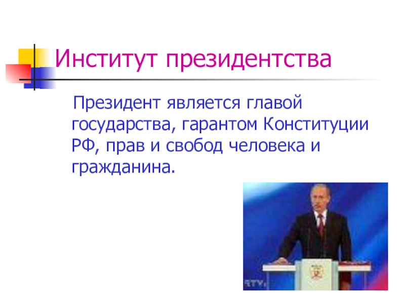 Институт президентства  Президент является главой государства, гарантом Конституции РФ, прав и свобод человека и гражданина.