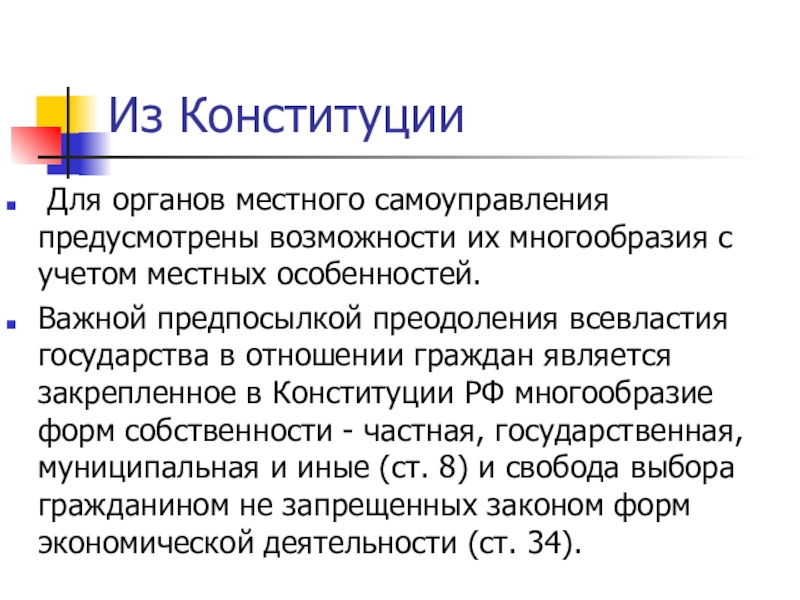 Из Конституции Для органов местного самоуправления предусмотрены возможности их многообразия с учетом местных особенностей.Важной предпосылкой преодоления всевластия