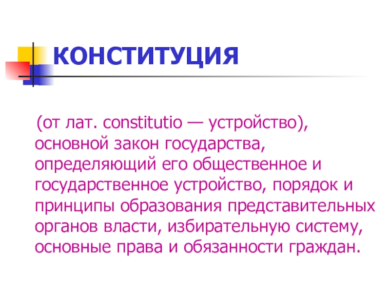 КОНСТИТУЦИЯ (от лат. constitutio — устройство), основной закон государства, определяющий его общественное и государственное устройство, порядок и принципы образования представительных органов власти, избирательную систему, основные права и обязанности граждан.