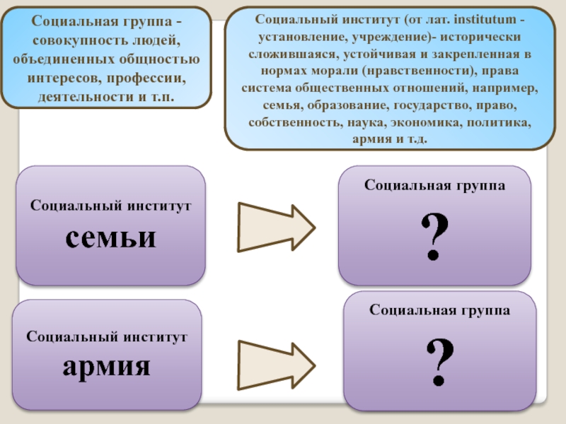 Социальный институт (от лат. institutum - установление, учреждение)- исторически сложившаяся, устойчивая и закрепленная в нормах морали (нравственности), права система общественных отношений, например, семья, образование, государство, право, собственность, наука, экономика, политика, армия и т.д.