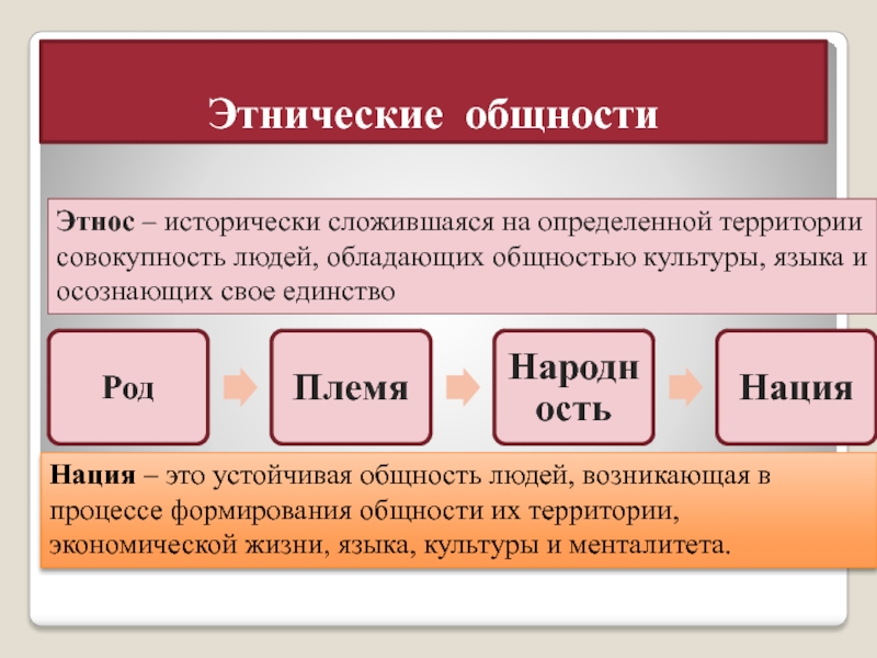 Нация – это устойчивая общность людей, возникающая в процессе формирования общности их территории, экономической жизни, языка, культуры и менталитета.