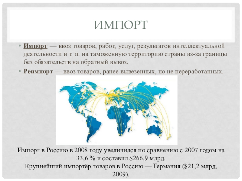 Импорт в Россию в 2008 году увеличился по сравнению с 2007 годом на 33,6 % и составил $266,9 млрд.