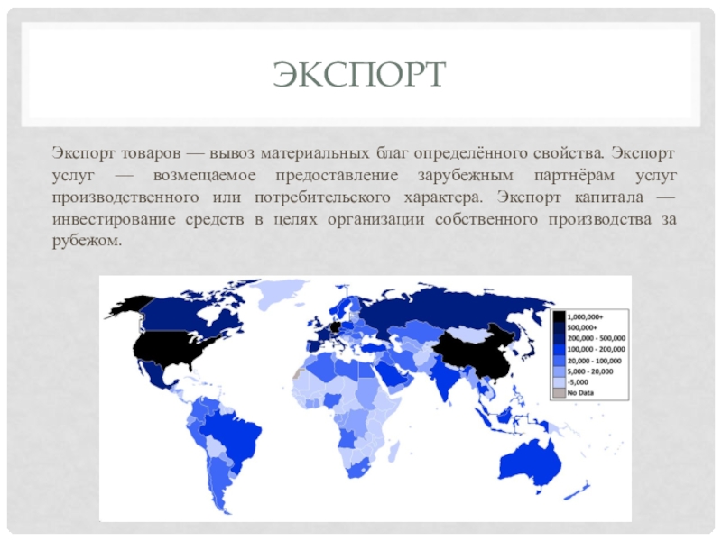 Внешняя торговля данной страны с другими странами состоит из экспорта (вывоза) и импорта (ввоза). Соотношение стоимости вывоза и ввоза составляет торговый баланс.