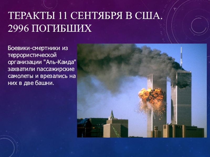 Боевики-смертники из террористической организации "Аль-Каида" захватили пассажирские самолеты и врезались на них в две башни.