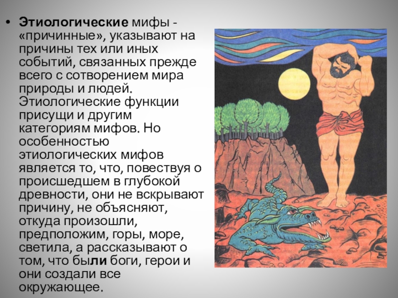 Слайд 9Этиологические мифы - «причинные», указывают на причины тех или иных событий,