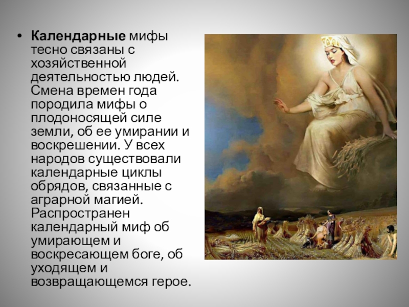 Слайд 11Календарные мифы тесно связаны с хозяйственной деятельностью людей. Смена времен года