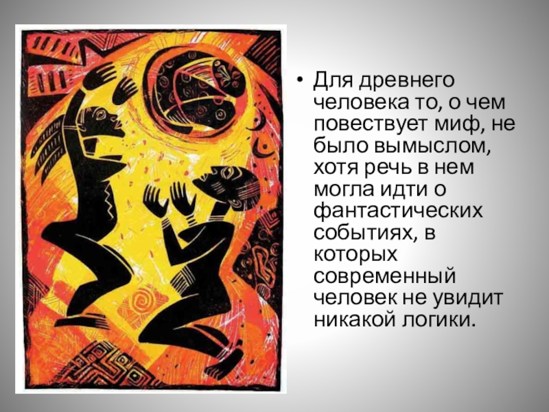 Слайд 6Для древнего человека то, о чем повествует миф, не было вымыслом,