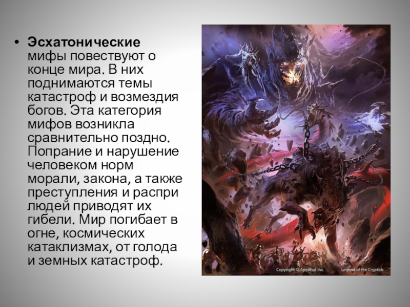 Слайд 13Эсхатонические мифы повествуют о конце мира. В них поднимаются темы