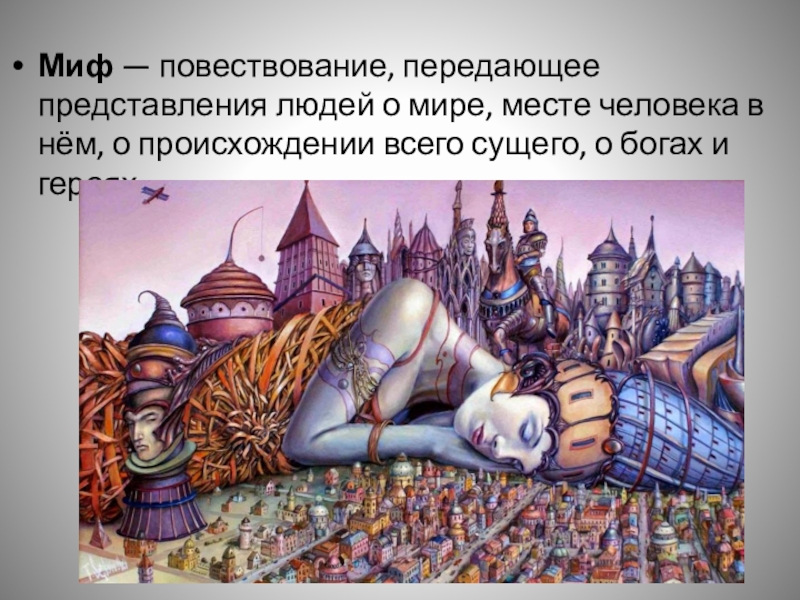 Слайд 2Миф — повествование, передающее представления людей о мире, месте человека в нём,