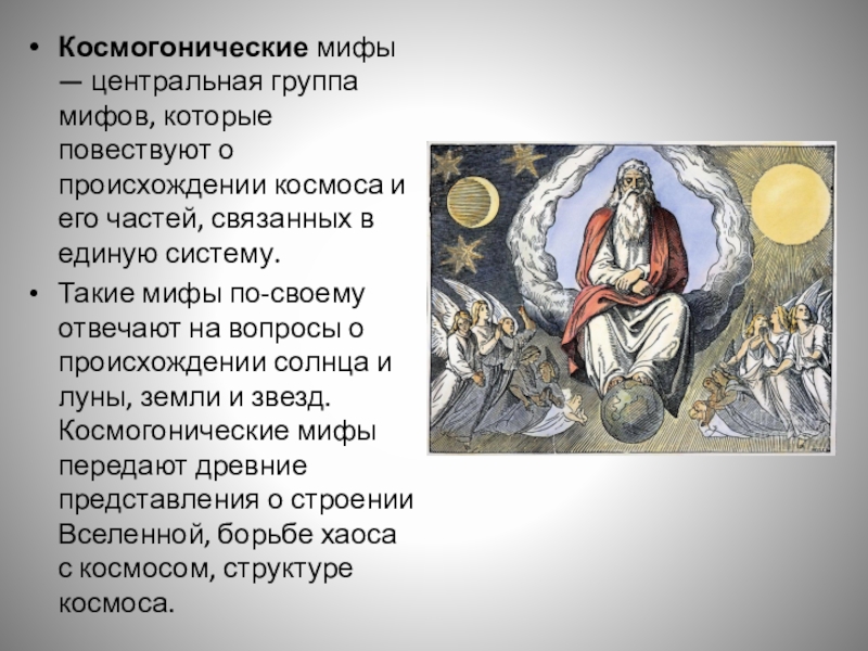 Слайд 10Космогонические мифы — центральная группа мифов, которые повествуют о происхождении космоса
