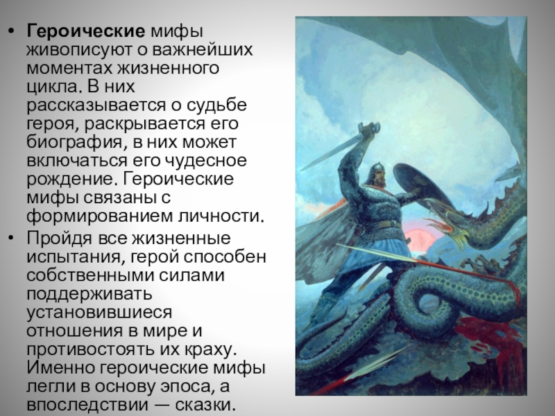 Слайд 12Героические мифы живописуют о важнейших моментах жизненного цикла. В них рассказывается