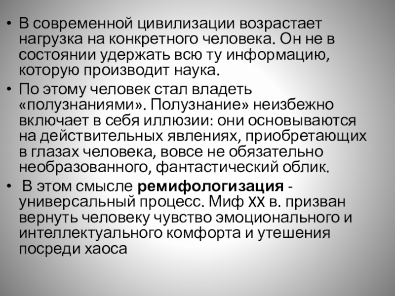 В этом смысле ремифологизация - универсальный процесс. Миф XX в. призван вернуть человеку чувство эмоционального и интеллектуального комфорта и утешения посреди хаоса