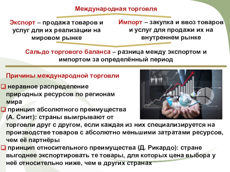 Мировая торговля – процесс купли-продажи товаров, осуществляемый продавцами, покупателями, посредниками в разных странах.
