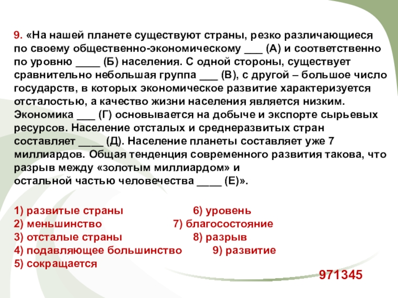 3) отсталые страны 8) разрыв