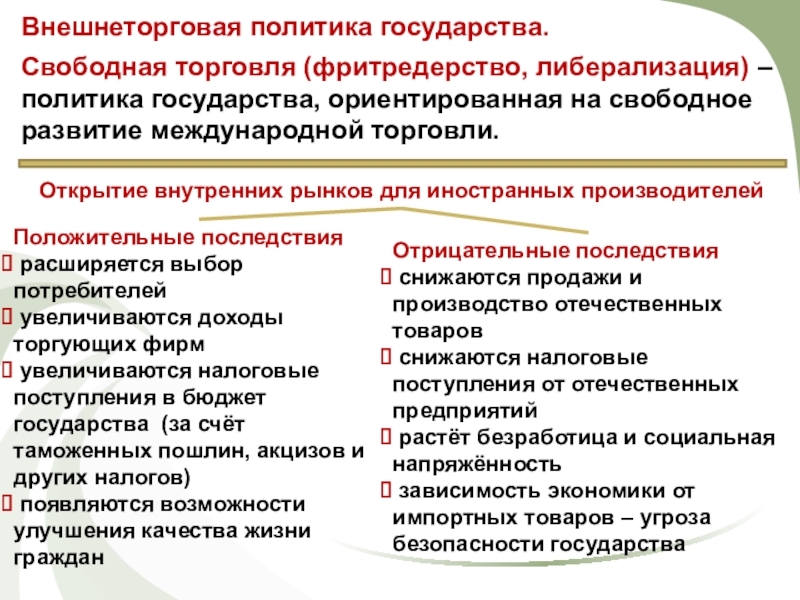 Свободная торговля (фритредерство, либерализация) – политика государства, ориентированная на свободное развитие международной торговли.
