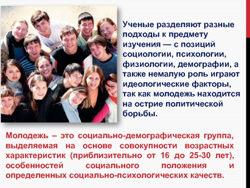 Ученые разделяют разные подходы к предмету изучения — с позиций социологии, психологии, физиологии, демографии, а также немалую роль играют идеологические факторы, так как молодежь находится на острие политической борьбы.