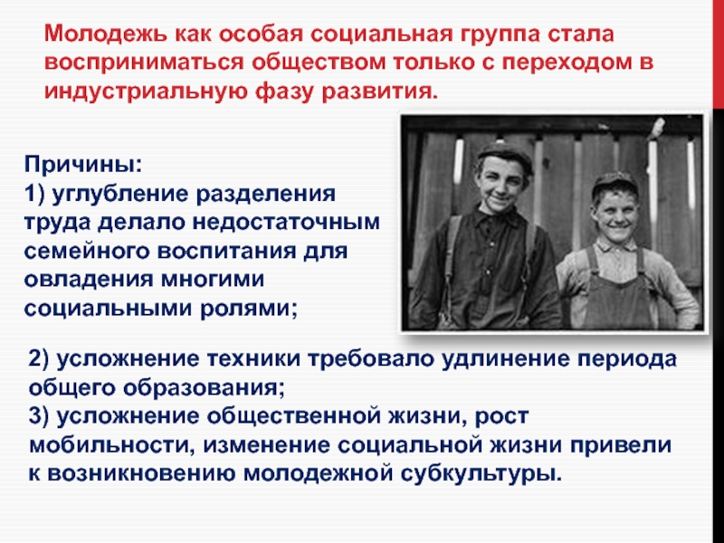 3) усложнение общественной жизни, рост мобильности, изменение социальной жизни привели к возникновению молодежной субкультуры.