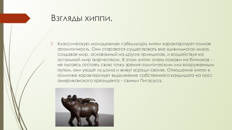 вне «цивильного» мира, создавая мир, основанный на других принципах, и воздействуя на остальной мир творчеством. В этом хиппи очень похожи на битников – не пытаясь отстоять свою точку зрения политическим или вооруженным путем, они уходят из дома и живут «среди своих». Отношение хиппи к политике характеризует выдвижение собственного кандидата на пост американского президента – свиньи Пигасуса.