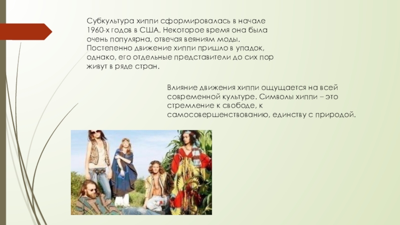 Слайд 3Субкультура хиппи сформировалась в начале 1960-х годов в США. Некоторое время