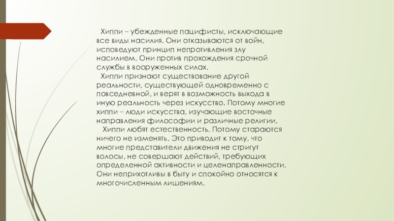 Слайд 15 Хиппи – убежденные пацифисты, исключающие все виды насилия. Они отказываются