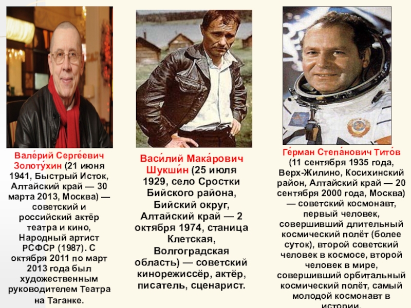 Васи́лий Мака́рович Шукши́н (25 июля 1929, село Сростки Бийского района, Бийский округ, Алтайский край — 2 октября 1974, станица Клетская, Волгоградская область) — советский кинорежиссёр, актёр, писатель, сценарист.
