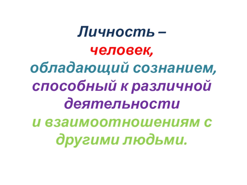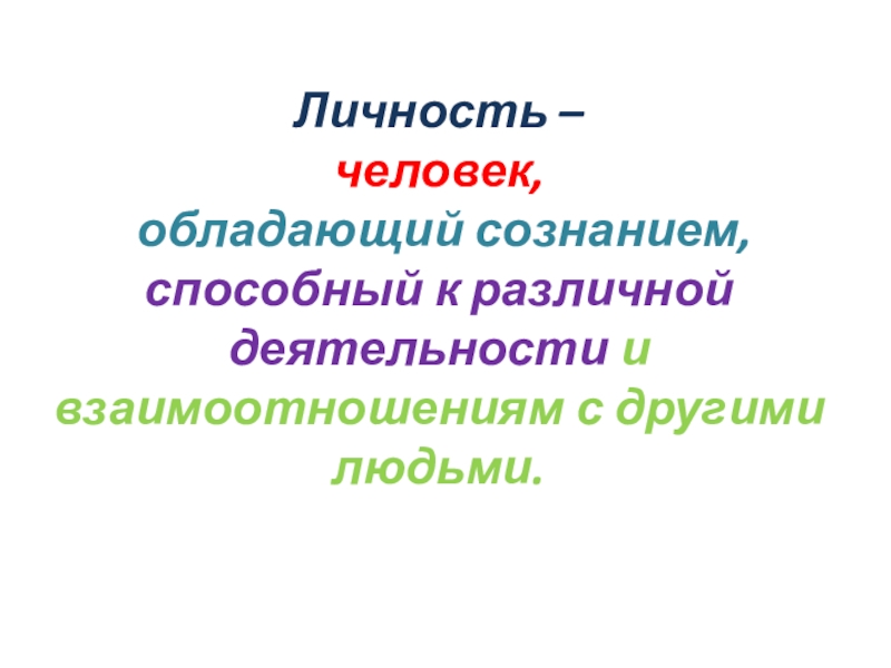Личность – человек, обладающий сознанием, способный к различной деятельности и взаимоотношениям с другими людьми.