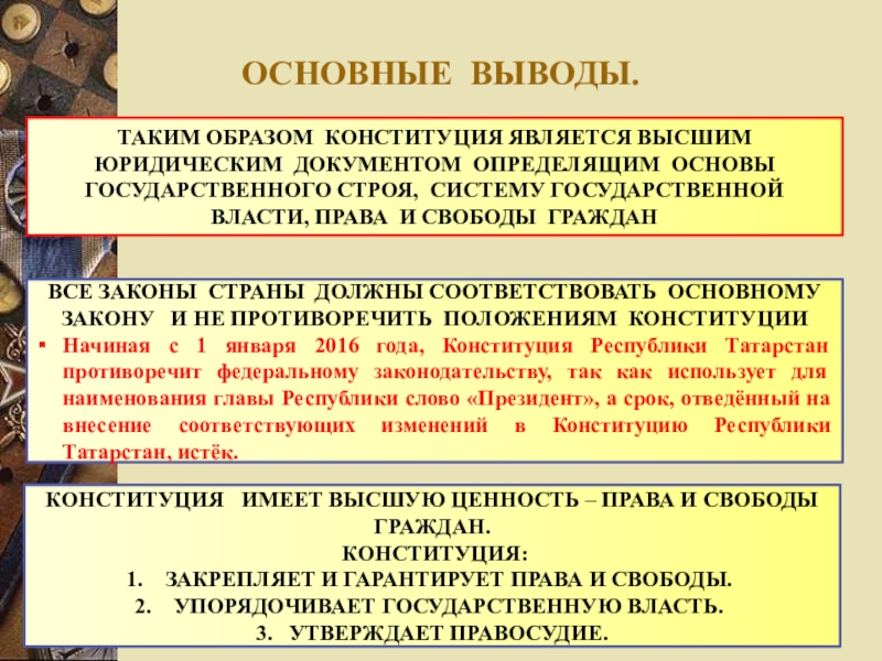 ВСЕ ЗАКОНЫ СТРАНЫ ДОЛЖНЫ СООТВЕТСТВОВАТЬ ОСНОВНОМУ ЗАКОНУ И НЕ ПРОТИВОРЕЧИТЬ ПОЛОЖЕНИЯМ КОНСТИТУЦИИ