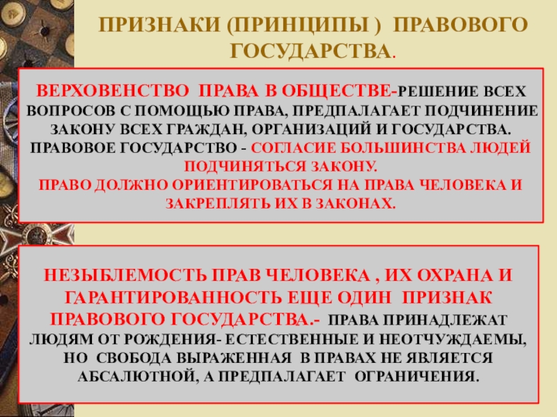 НЕЗЫБЛЕМОСТЬ ПРАВ ЧЕЛОВЕКА , ИХ ОХРАНА И ГАРАНТИРОВАННОСТЬ ЕЩЕ ОДИН ПРИЗНАК ПРАВОВОГО ГОСУДАРСТВА.- ПРАВА ПРИНАДЛЕЖАТ ЛЮДЯМ ОТ РОЖДЕНИЯ- ЕСТЕСТВЕННЫЕ И НЕОТЧУЖДАЕМЫ, НО СВОБОДА ВЫРАЖЕННАЯ В ПРАВАХ НЕ ЯВЛЯЕТСЯ АБСАЛЮТНОЙ, А ПРЕДПАЛАГАЕТ ОГРАНИЧЕНИЯ.