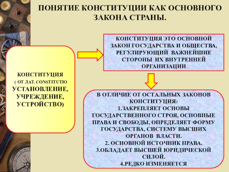 1.ЗАКРЕПЛЯЕТ ОСНОВЫ ГОСУДАРСТВЕННОГО СТРОЯ, ОСНОВНЫЕ ПРАВА И СВОБОДЫ, ОПРЕДЕЛЯЕТ ФОРМУ ГОСУДАРСТВА, СИСТЕМУ ВЫСШИХ ОРГАНОВ ВЛАСТИ.