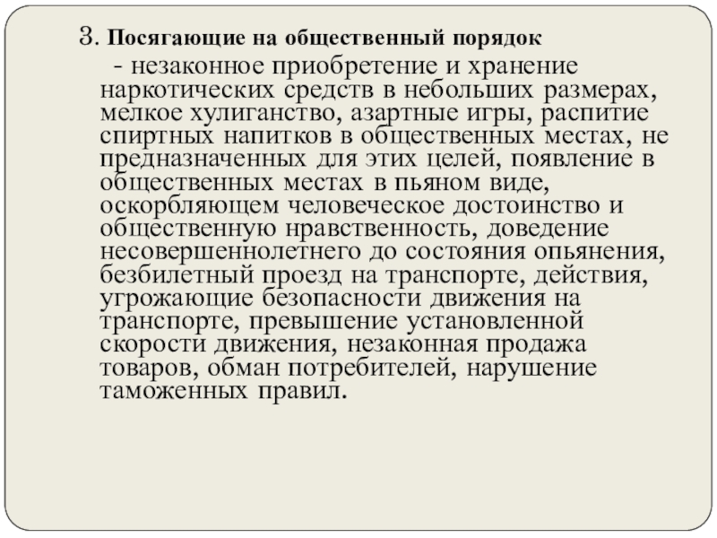 хранение наркотических средств в небольших размерах, мелкое хулиганство, азартные игры, распитие спиртных напитков в общественных местах, не предназначенных для этих целей, появление в общественных местах в пьяном виде, оскорбляющем человеческое достоинство и общественную нравственность, доведение несовершеннолетнего до состояния опьянения, безбилетный проезд на транспорте, действия, угрожающие безопасности движения на транспорте, превышение установленной скорости движения, незаконная продажа товаров, обман потребителей, нарушение таможенных правил.