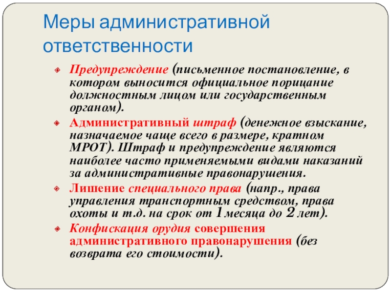 Административный штраф (денежное взыскание, назначаемое чаще всего в размере, кратном МРОТ). Штраф и предупреждение являются наиболее часто применяемыми видами наказаний за административные правонарушения.