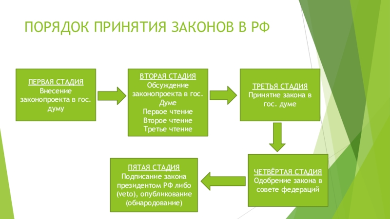 Подписание закона президентом РФ либо (veto), опубликование (обнародование)