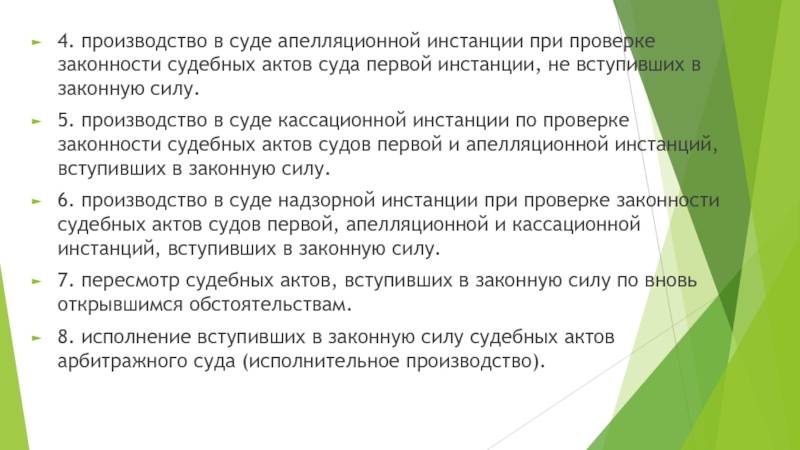 5. производство в суде кассационной инстанции по проверке законности судебных актов судов первой и апелляционной инстанций, вступивших в законную силу.