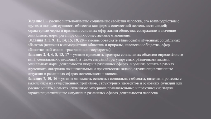 Слайд 2Задание 1 – умение знать/понимать: социальные свойства человека, его взаимодействие с