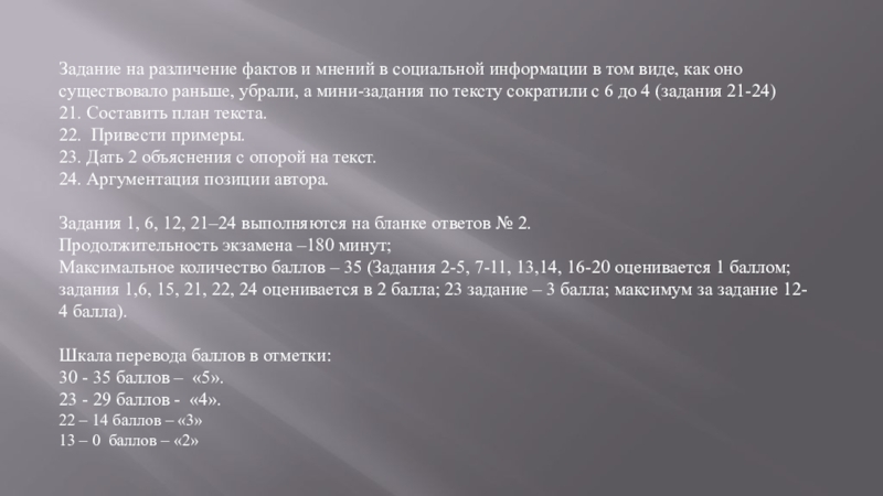 экзамена — теперь задания группируются по тому, какие навыки школьника проверяются. Отсутствует разделение заданий на части. Общее количество заданий в КИМ сокращено с 31 до 24. Максимальный балл 35 (вместо 39).