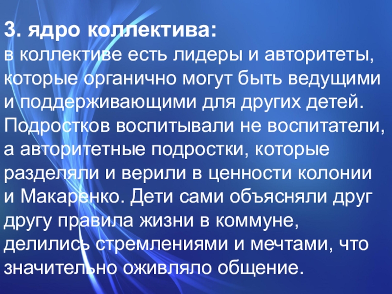 могут быть ведущими и поддерживающими для других детей. Подростков воспитывали не воспитатели, а авторитетные подростки, которые разделяли и верили в ценности колонии и Макаренко. Дети сами объясняли друг другу правила жизни в коммуне, делились стремлениями и мечтами, что значительно оживляло общение.