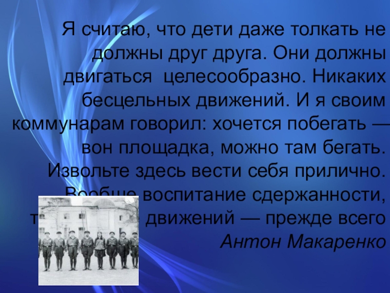 должны двигаться  целесообразно. Никаких бесцельных движений. И я своим коммунарам говорил: хочется побегать — вон площадка, можно там бегать. Извольте здесь вести себя прилично. Вообще воспитание сдержанности, торможение движений — прежде всего Антон Макаренко