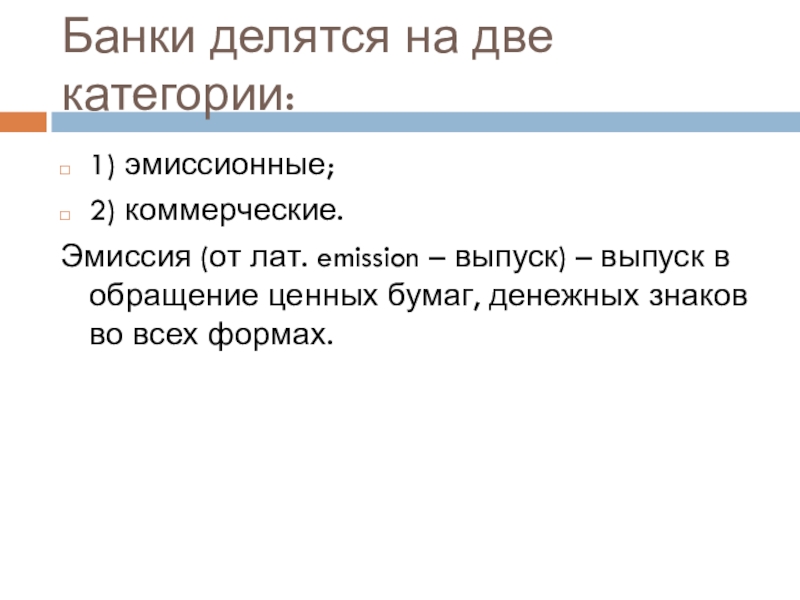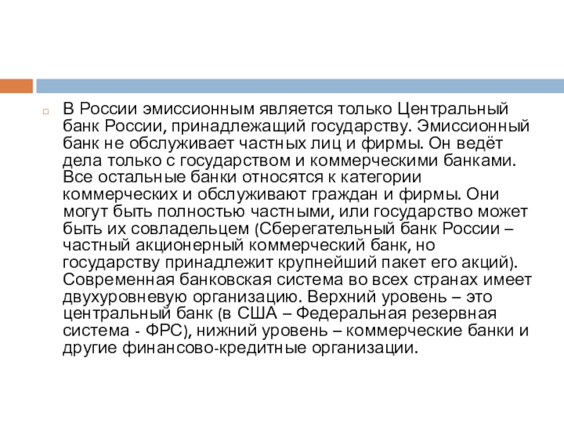 Слайд 7В России эмиссионным является только Центральный банк России, принадлежащий государству. Эмиссионный