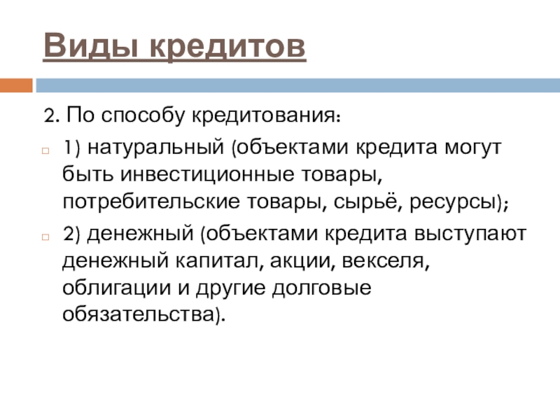 2) денежный (объектами кредита выступают денежный капитал, акции, векселя, облигации и другие долговые обязательства).