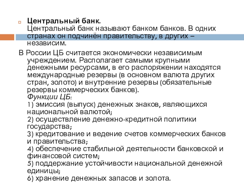В России ЦБ считается экономически независимым учреждением. Располагает самыми крупными денежными ресурсами, в его распоряжении находятся международные резервы (в основном валюта других стран, золото) и внутренние резервы (обязательные резервы коммерческих банков).