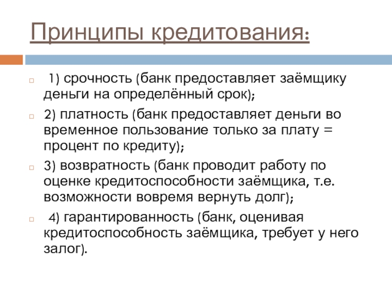 3) возвратность (банк проводит работу по оценке кредитоспособности заёмщика, т.е. возможности вовремя вернуть долг);
